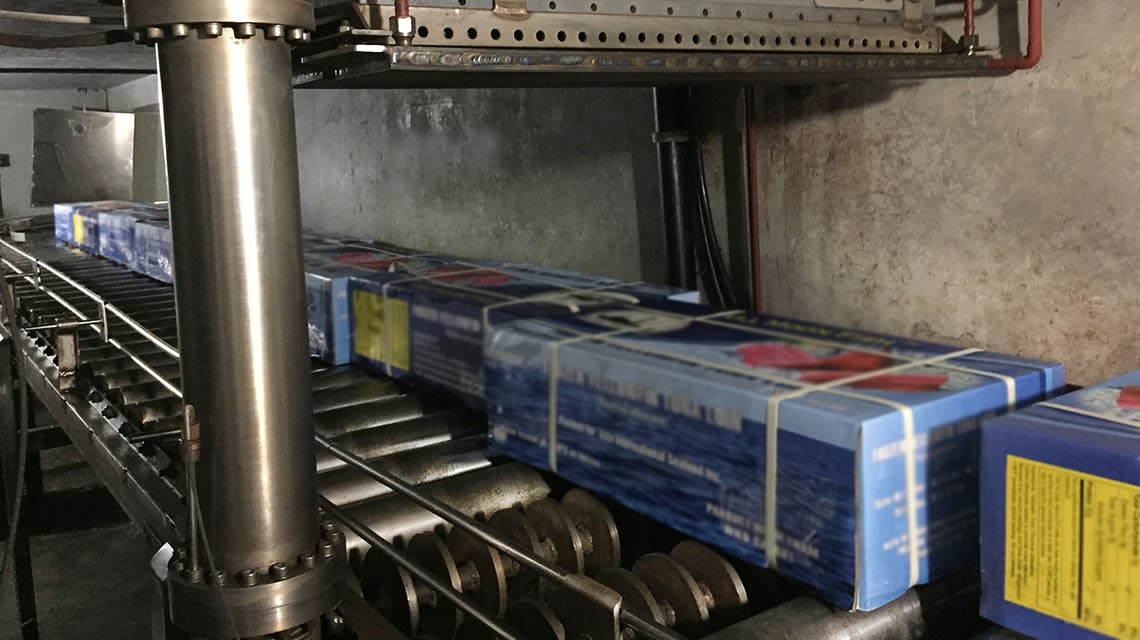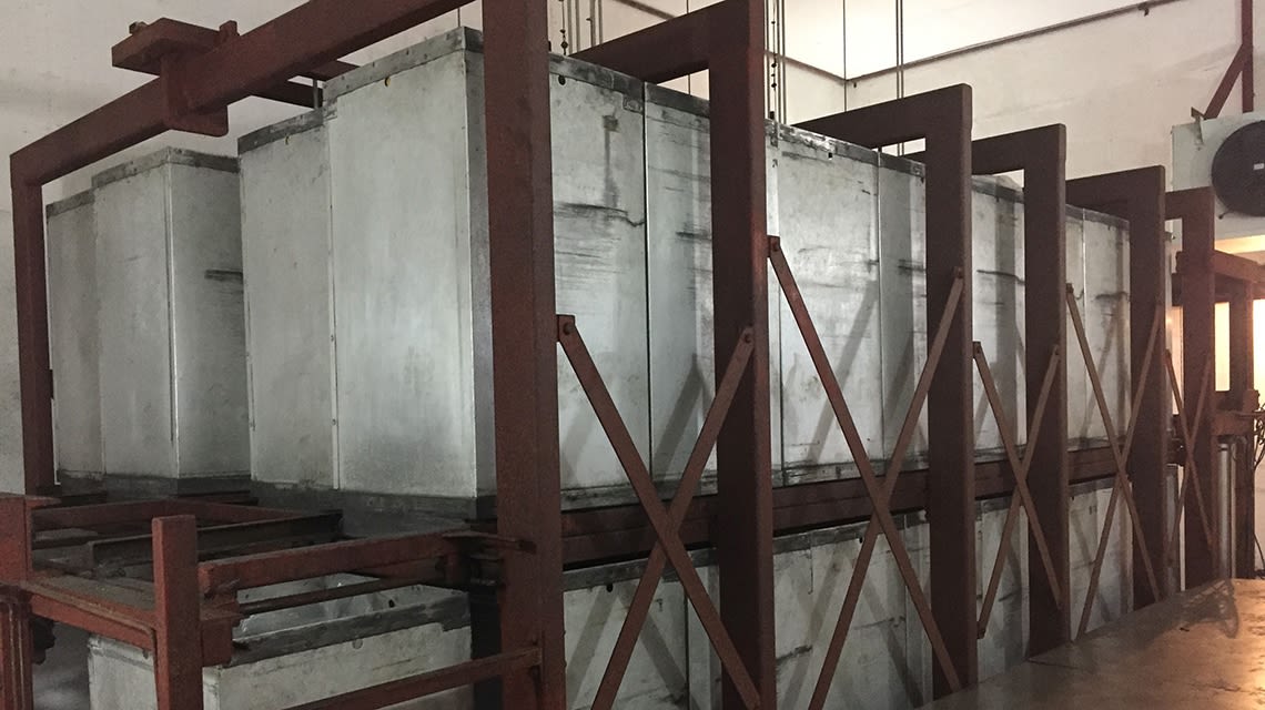 Tall aluminum boxes filled with food products await irradiation using the gamma irradiator.